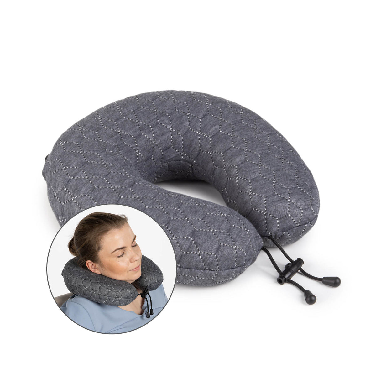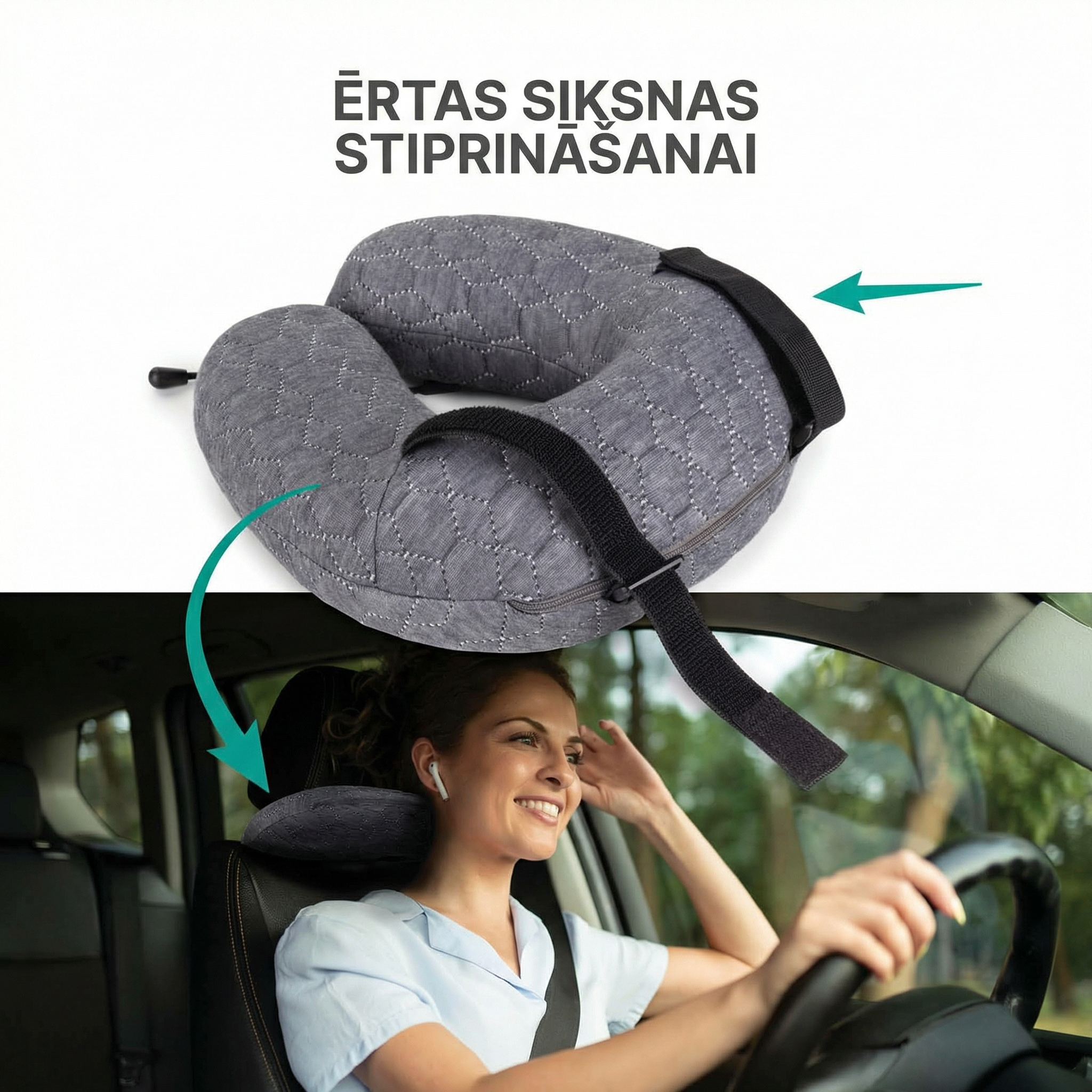 - Ergonomiskā spilvena forma uztur pareizu kakla stāju un atslābina muskuļus garu ceļojumu laikā.
