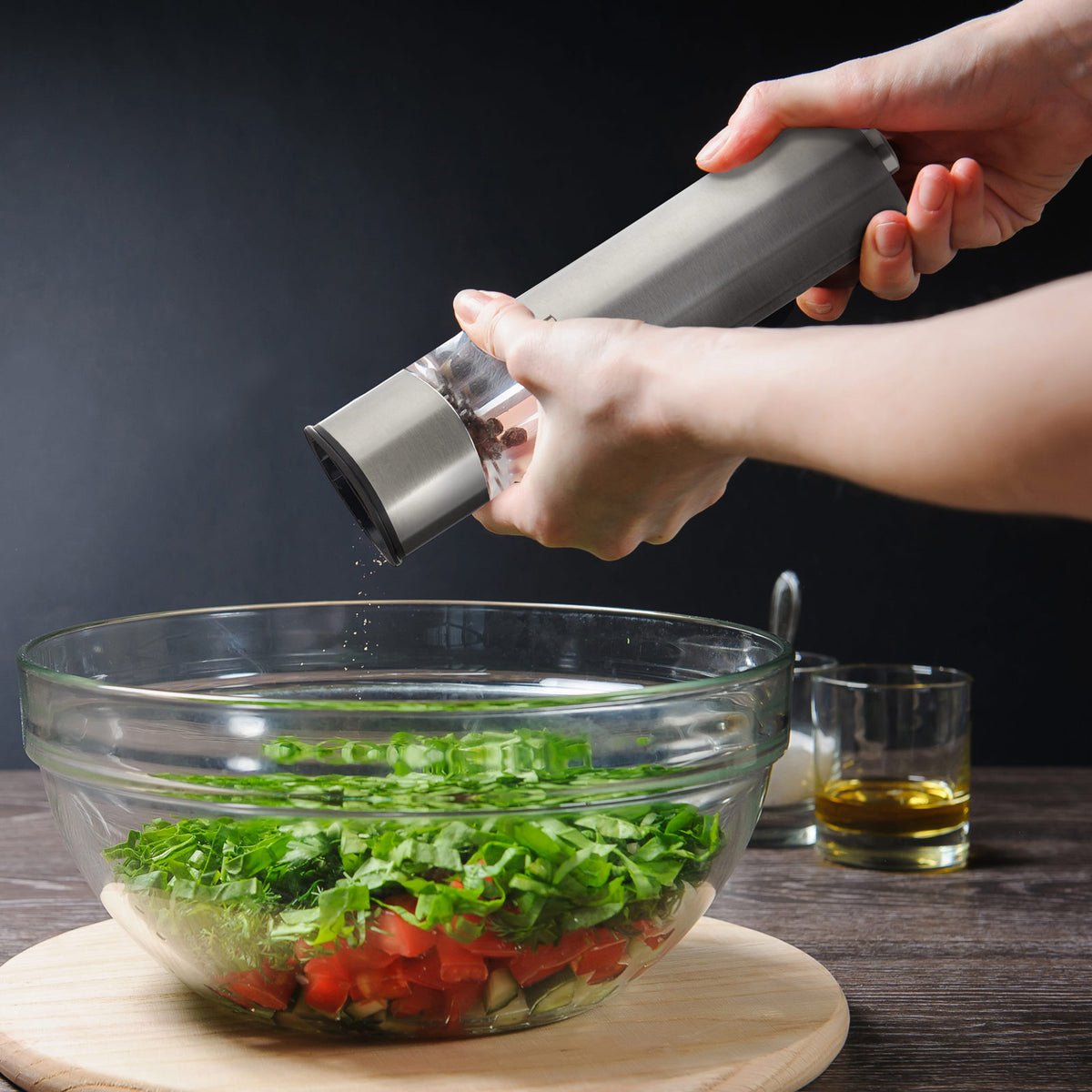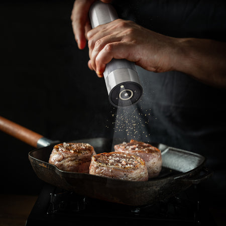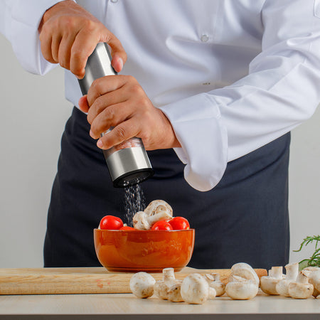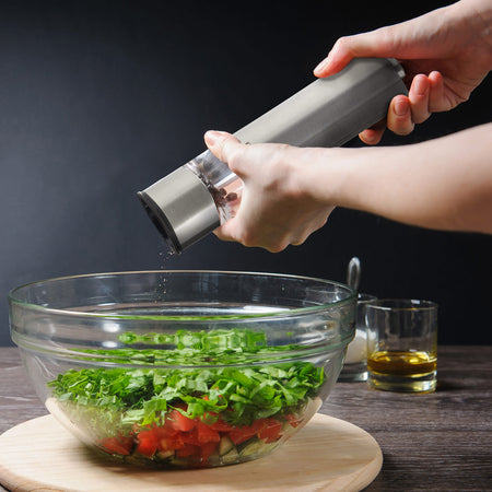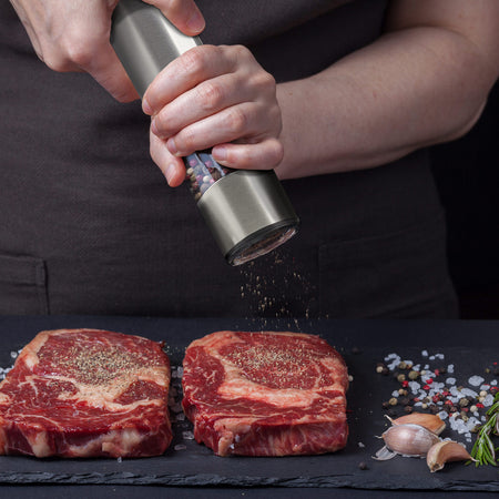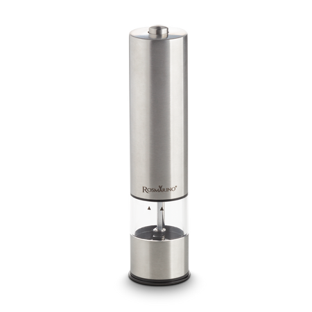 - Sāls vai piparu dzirnaviņa uz baterijām, izgatavota no nerūsējošā tērauda.